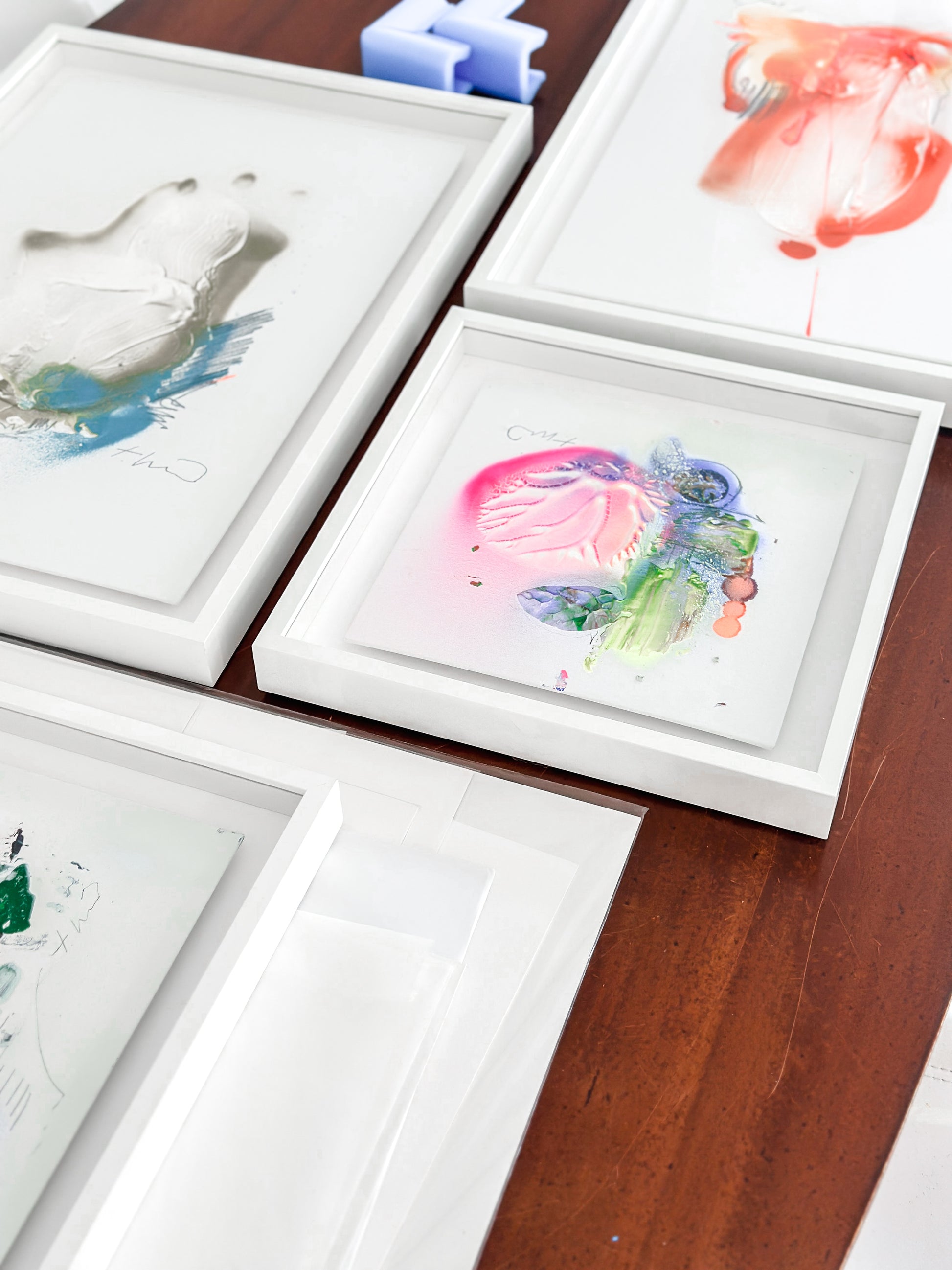 Entdecken Sie die professionell gerahmten Farbstudien auf Leinenplatten, erhältlich in verschiedenen Maßen. Diese Arbeiten sind nicht nur eigenständige Kunstwerke, sondern auch Vorreiter und Wegbereiter für Theresa Kallraths großformatigen Leinwandarbeiten. Sie setzen sich mit Farben, Formen und Techniken auseinander, um die Grundlage für größere Canvas-Arbeiten zu schaffen.
