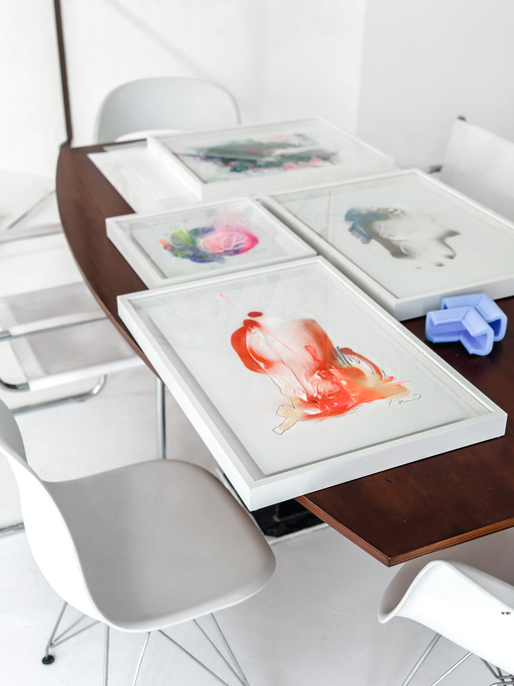 Die charmanten Farbstudien sind wegen ihrer kompakten Größe (z. B. 50 x 70 x 5 cm) beliebt. Im skandinavischen Interior-Laden H&M Home am Standort Düsseldorf wurden diese Werke bereits ausgestellt und haben dort Kunst- und Designliebhaber gleichermaßen begeistert.