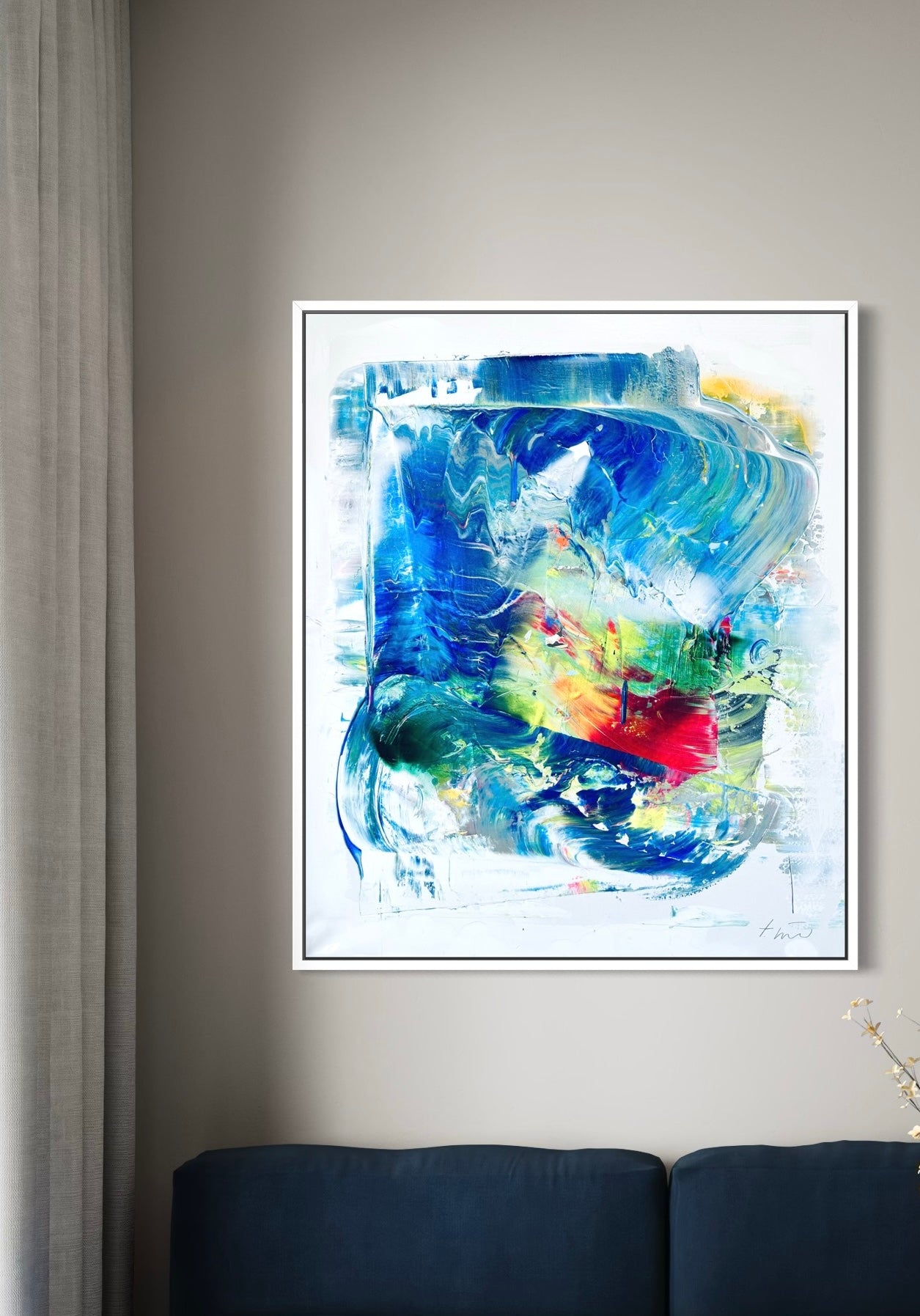 Ein Bild wie ein Innehalten. „AMALFI“ ist ein 100 x 120 cm großes Original auf Leinen, das in starken Blautönen gehalten ist. Die abstrakte Malerei wirkt laut, stark und energiegebend – eine moderne Leinwandarbeit von der Düsseldorfer Künstlerin Theresa Kallrath.