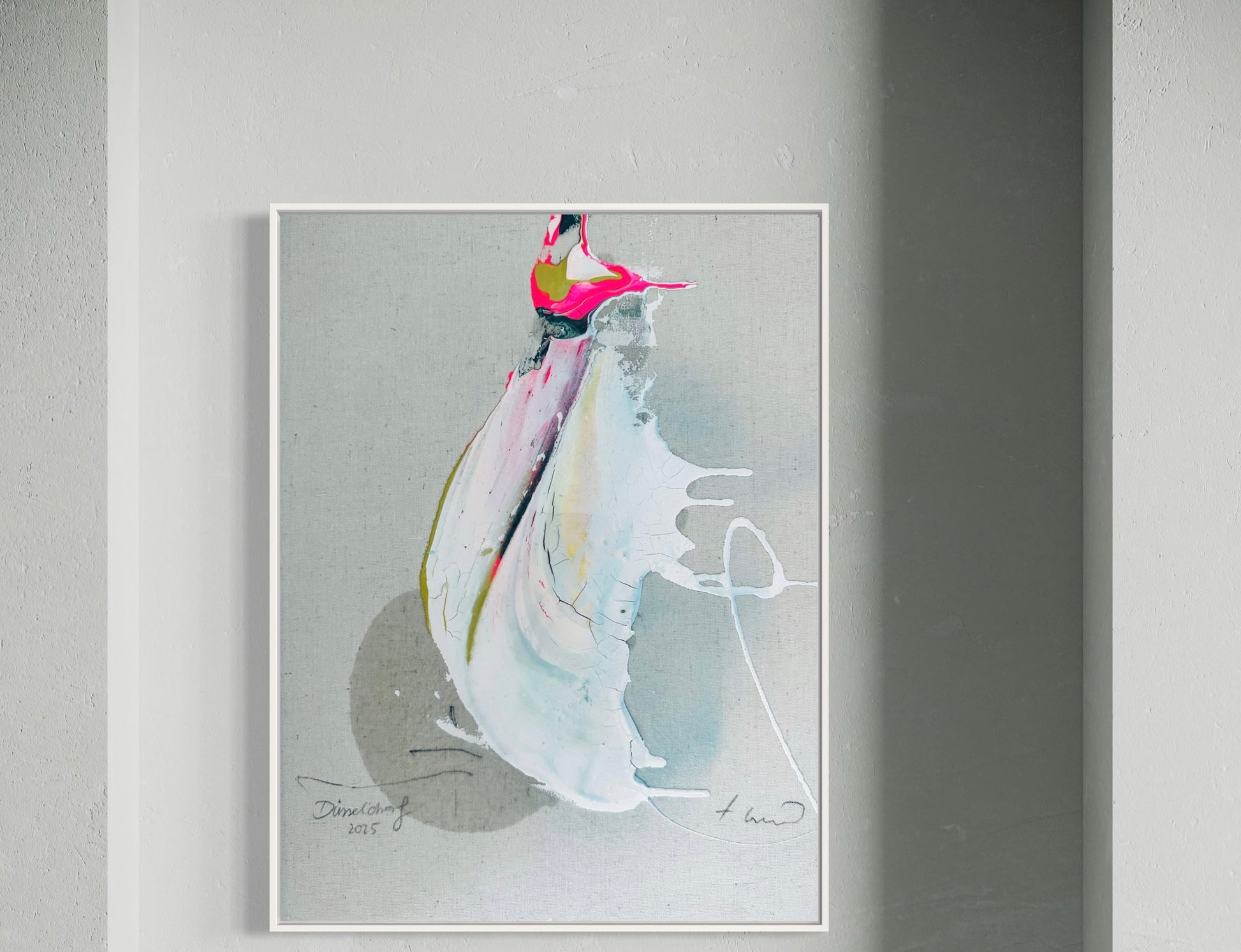Jede Leinwand ist von der Künstlerin persönlich auf Keilrahmen gespannt. Die professionelle Rahmung mit weißem Schattenfugenrahmen erfolgt durch einen lokalen Rahmbauer on demand, exklusive auf Anfrage. Alle Arbeiten sind vorderseitig signiert.