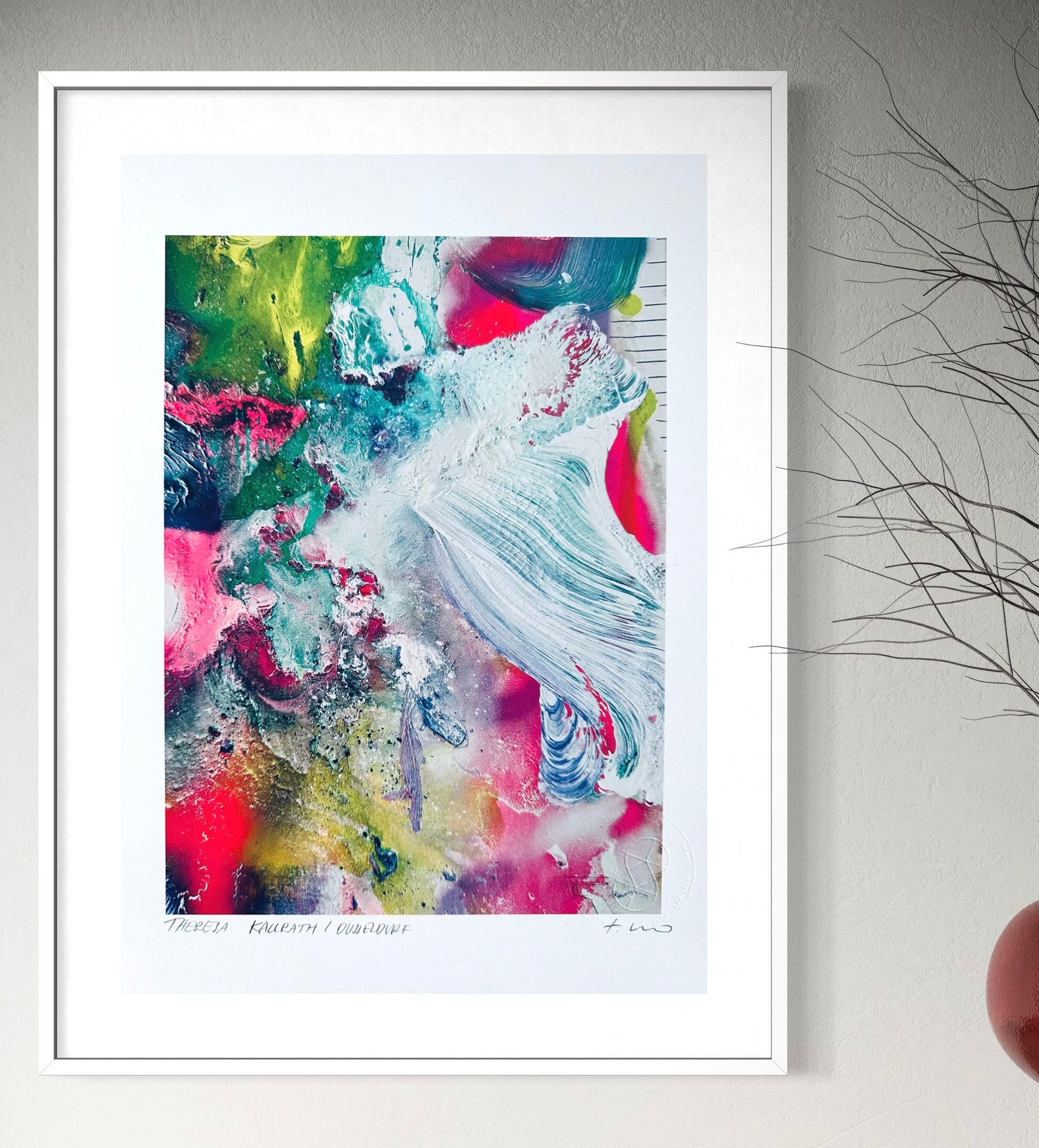 Die Fine Art Prints von Theresa Kallrath sind hochwertige Kunstdrucke auf Papier, gefertigt nach professionellen Standards und signiert sowie mit einem Prägestempel versehen. Jedes Blatt zeigt einen präzisen Motivausschnitt aus einer großformatigen Leinwandarbeit der Künstlerin. Die Drucke machen die farbstarken Pigmente, Bleistiftstrukturen, gestischen Pinselspuren und fluoreszierenden Sprayakzente sichtbar, die ihre abstrakte Malerei prägen. Die Editionen eignen sich als hochwertige Alternative zum Original und ermöglichen einen fundierten Einstieg in die zeitgenössische Malerei ohne Schwarz.