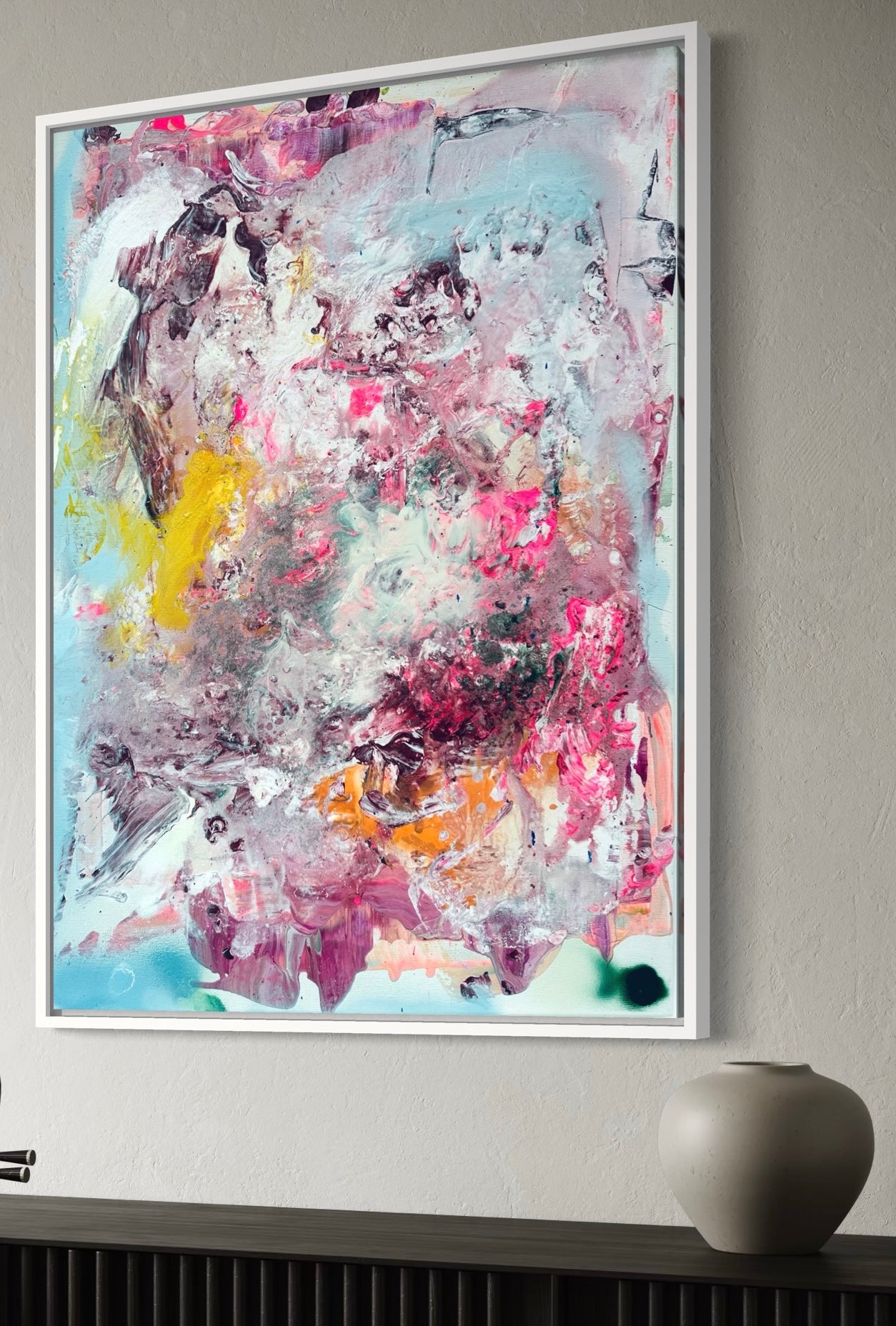 Die Schichten sind dicht gearbeitet und gleichzeitig transparent genug, um Bewegung spürbar zu machen. Kleine Risse und Übergänge lassen Tiefe entstehen, während die intensive Farbigkeit den Raum energetisch auflädt. Ein Bild, das Dynamik und Freiheit vermittelt.