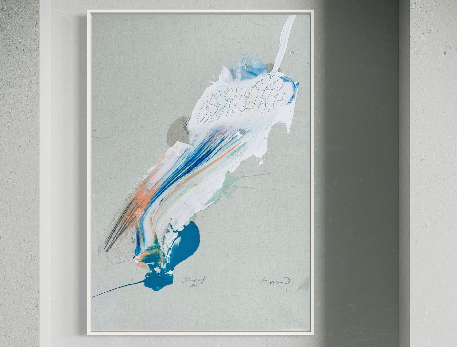 Jede Leinwand ist von der Künstlerin persönlich auf Keilrahmen gespannt. Die professionelle Rahmung mit weißem Schattenfugenrahmen erfolgt durch einen lokalen Rahmbauer on demand nach dem Kauf. Alle Arbeiten sind vorderseitig signiert.