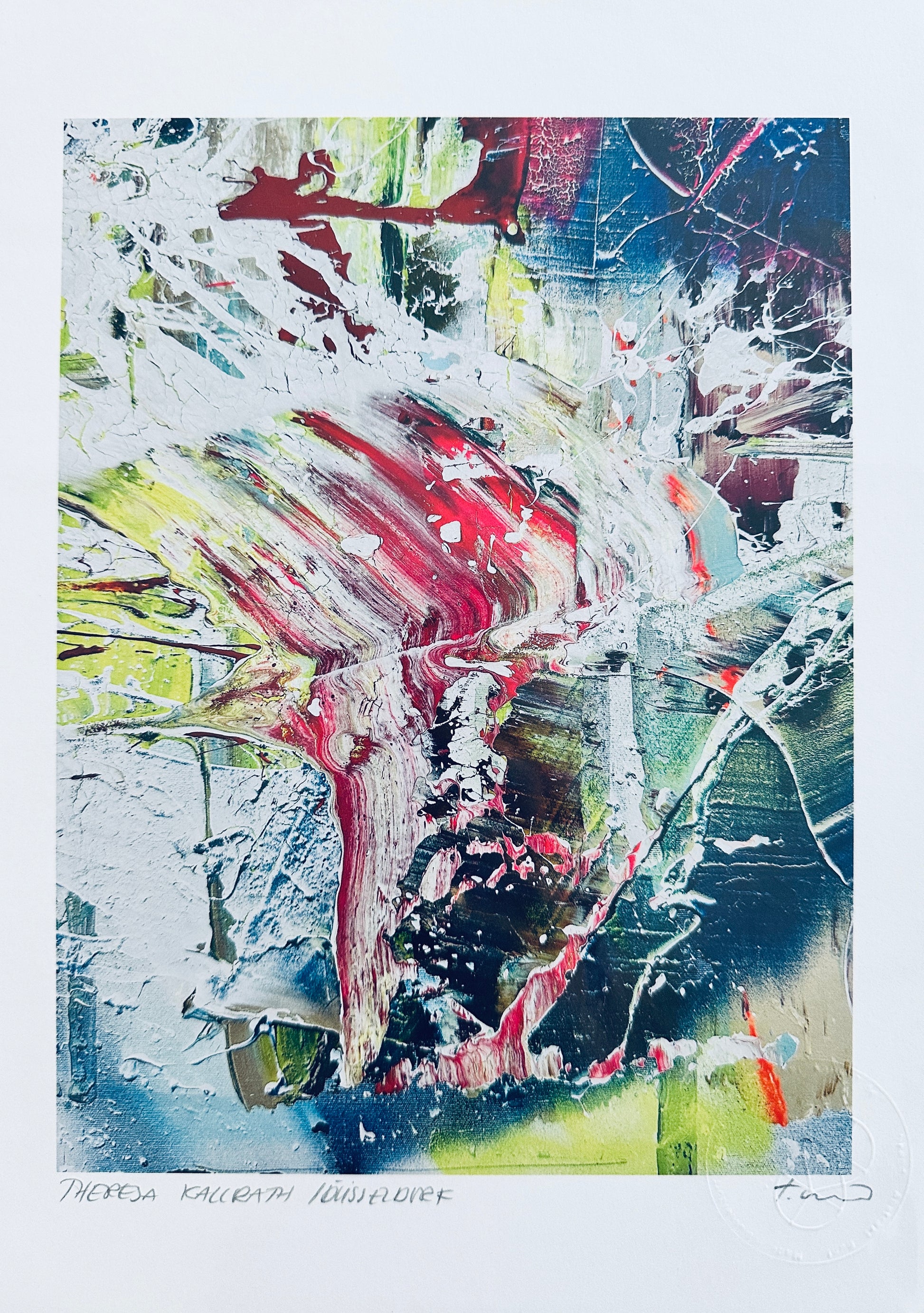 Die Fine Art Prints von Theresa Kallrath sind hochwertige Kunstdrucke auf Papier, gefertigt nach professionellen Standards und signiert sowie mit einem Prägestempel versehen. Jedes Blatt zeigt einen präzisen Motivausschnitt aus einer großformatigen Leinwandarbeit der Künstlerin. Die Drucke machen die farbstarken Pigmente, Bleistiftstrukturen, gestischen Pinselspuren und fluoreszierenden Sprayakzente sichtbar, die ihre abstrakte Malerei prägen. Die Editionen eignen sich als hochwertige Alternative zum Original und ermöglichen einen fundierten Einstieg in die zeitgenössische Malerei ohne Schwarz.